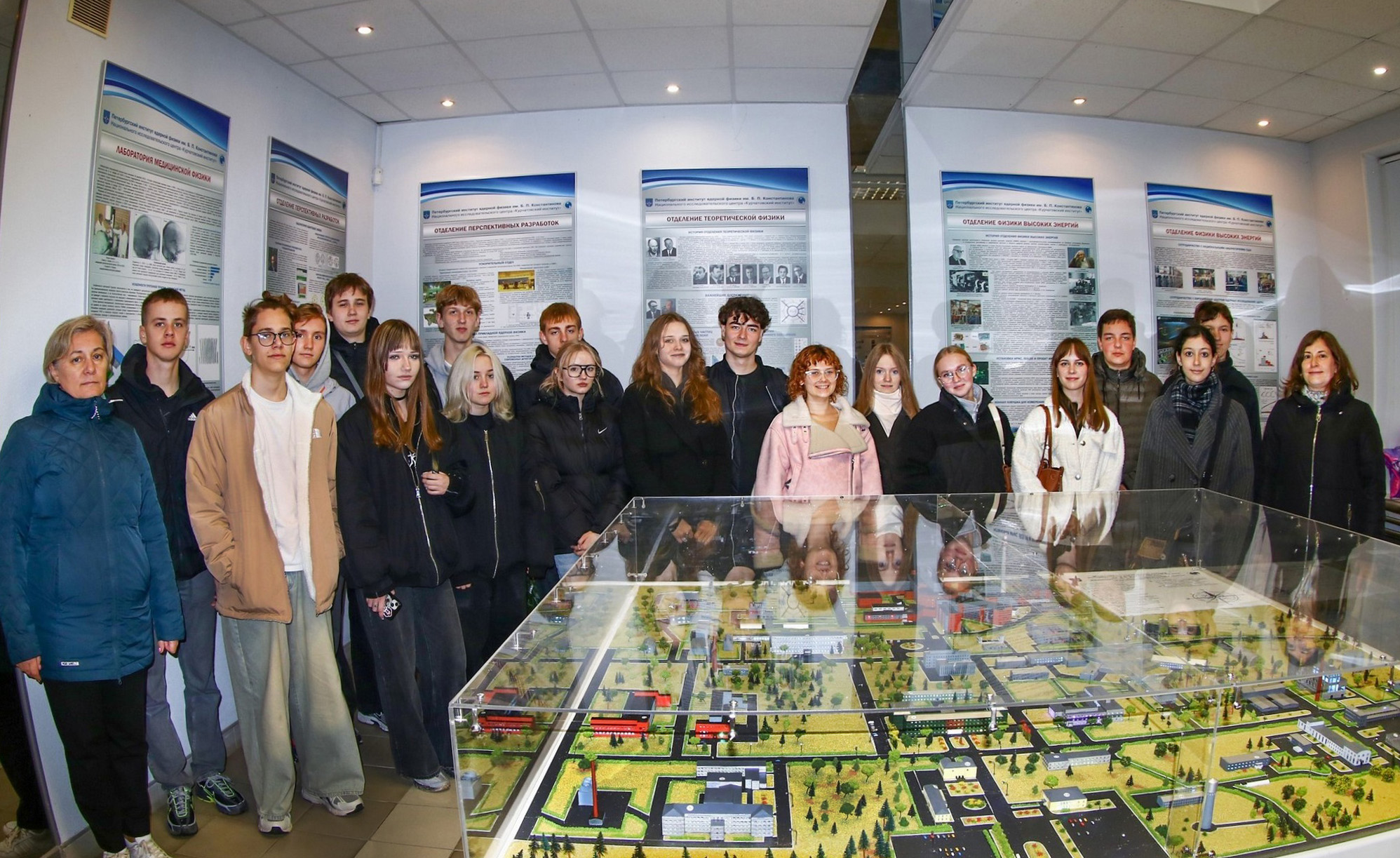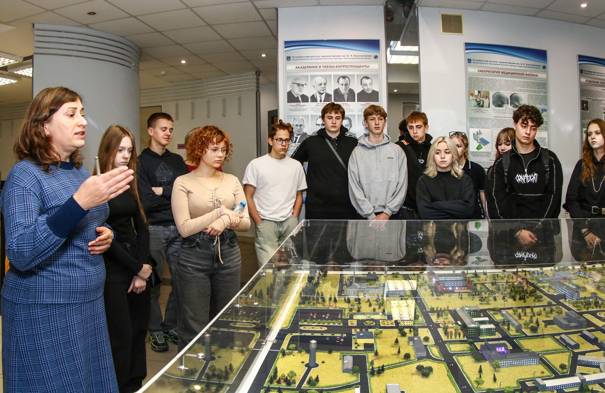 Старшеклассники посетили главный физический корпус, где у макета НТП специалист центра по подготовке персонала М.А. Трубицына рассказала об истории создания Петербургского института ядерной физики им. Б. П. Константинова (ПИЯФ), о том, чем занимается НИЦ «Курчатовский институт» - ПИЯФ в настоящее время, о физических установках Института, об этапах строительства реактора ПИК и о специальностях, которые сейчас востребованы.
