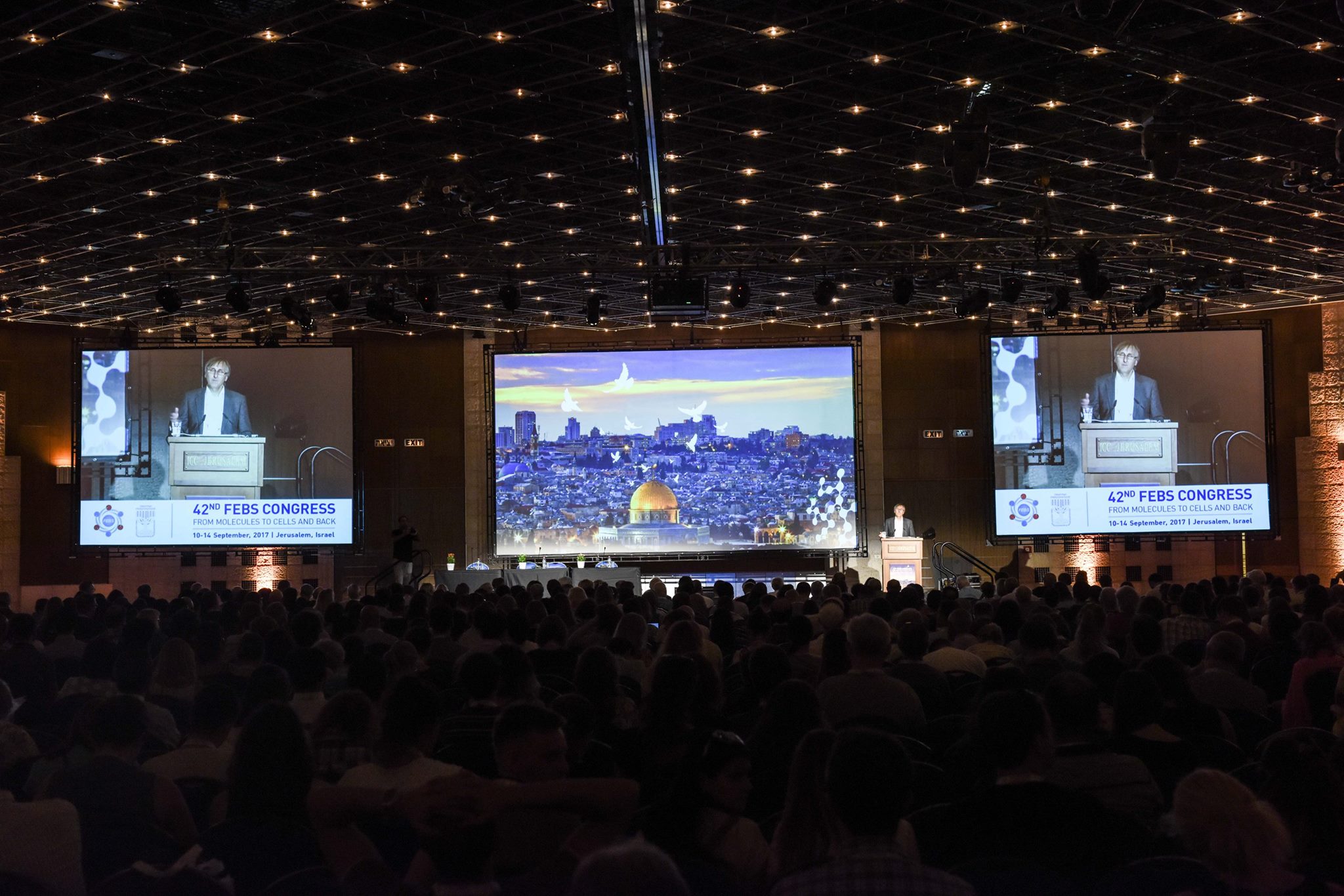 Вторник, 03 октября 2017В сентябре в Иерусалиме прошёл 42-й Конгресс Европейского Биохимического Общества – крупнейшее научное мероприятие, посвящённое новейшим достижениям в изучении биохимии, на которое съехалось более 1000 учёных из 60 стран. Исследователи, от студентов до нобелевских лауреатов, представляли результаты своей работы в области структурной биологии, биофизики, нейро- и онкобиологии, аутофагии, молекулярных механизмов патологий. Большое внимание было уделено аспектам фундаментальной биологии: механизмам функционирования молекулярных машин, сигнальных и метаболических сетей, ультраструктурному анализу различных биологических молекул, регуляции экспрессии генов.